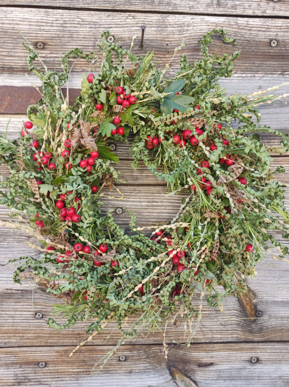 Ob der Kranz nur aus verschiedenem Grün bestehen soll, mit Zapfen oder mit über den Sommer getrockneten Blumen versehen wird, entscheidet jede/r für sich.